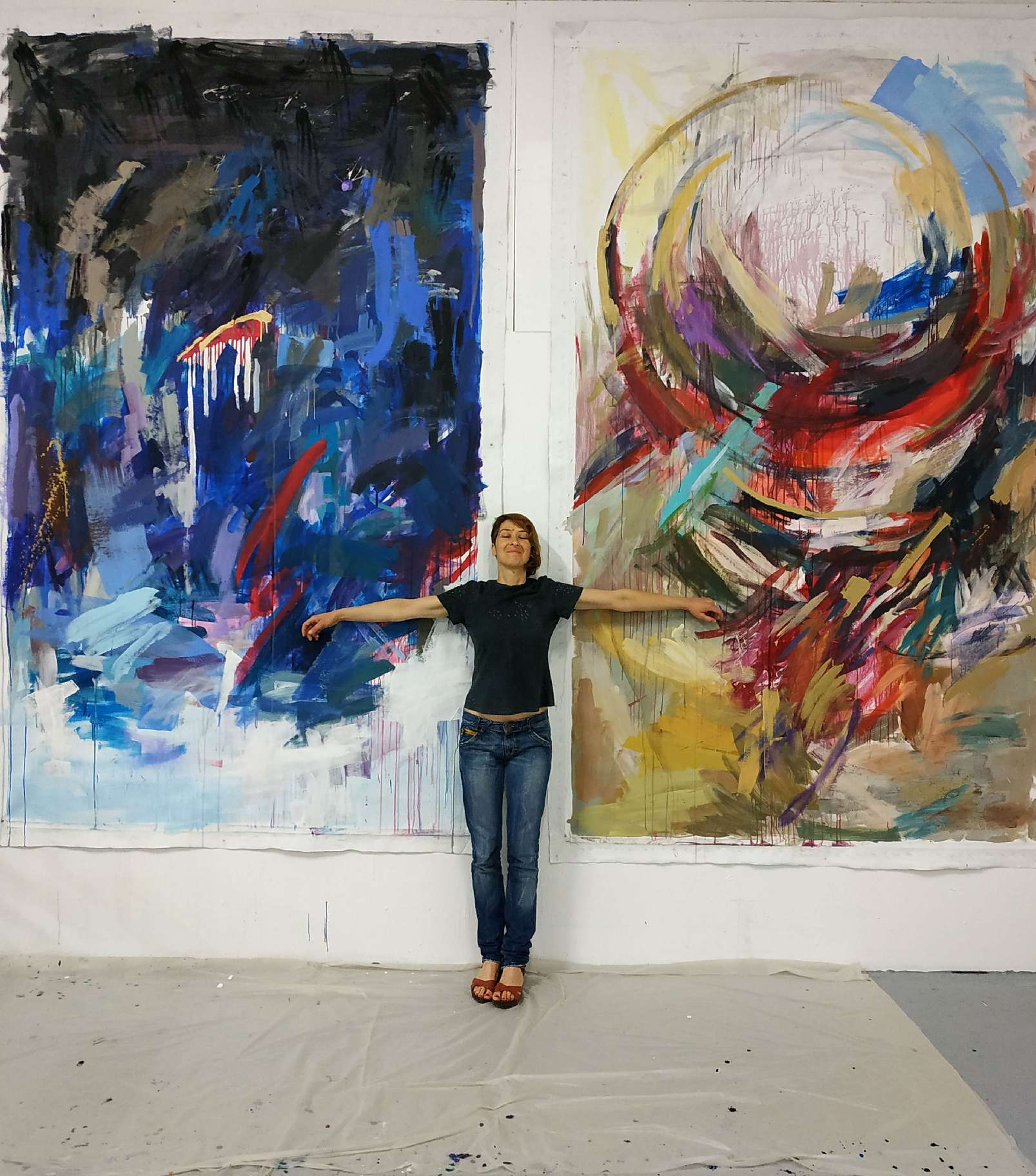 Cette artiste plasticienne peint aussi bien des petits que des très grands formats, crée des mosaïques, des fresques, réalise des vitraux, pour finalement mélanger tous ces supports.