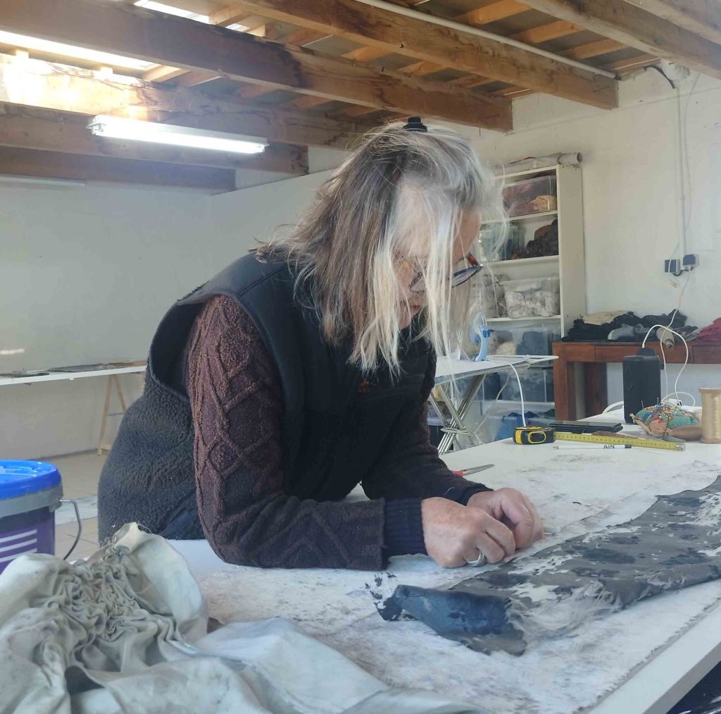 A commencer par la matière utilisée : le textile. Son travail s’inscrit dans l’ouverture de l’art contemporain à une multitude de matériaux, souvent humbles et inattendus, ouverture fertile comme en témoigne le travail de l’artiste et que l’espace voudrait documenter. Ensuite, par l’association de la nature à la transformation du matériau, et par la place qui, de ce fait, est donnée à l’aléatoire dans le processus de création.